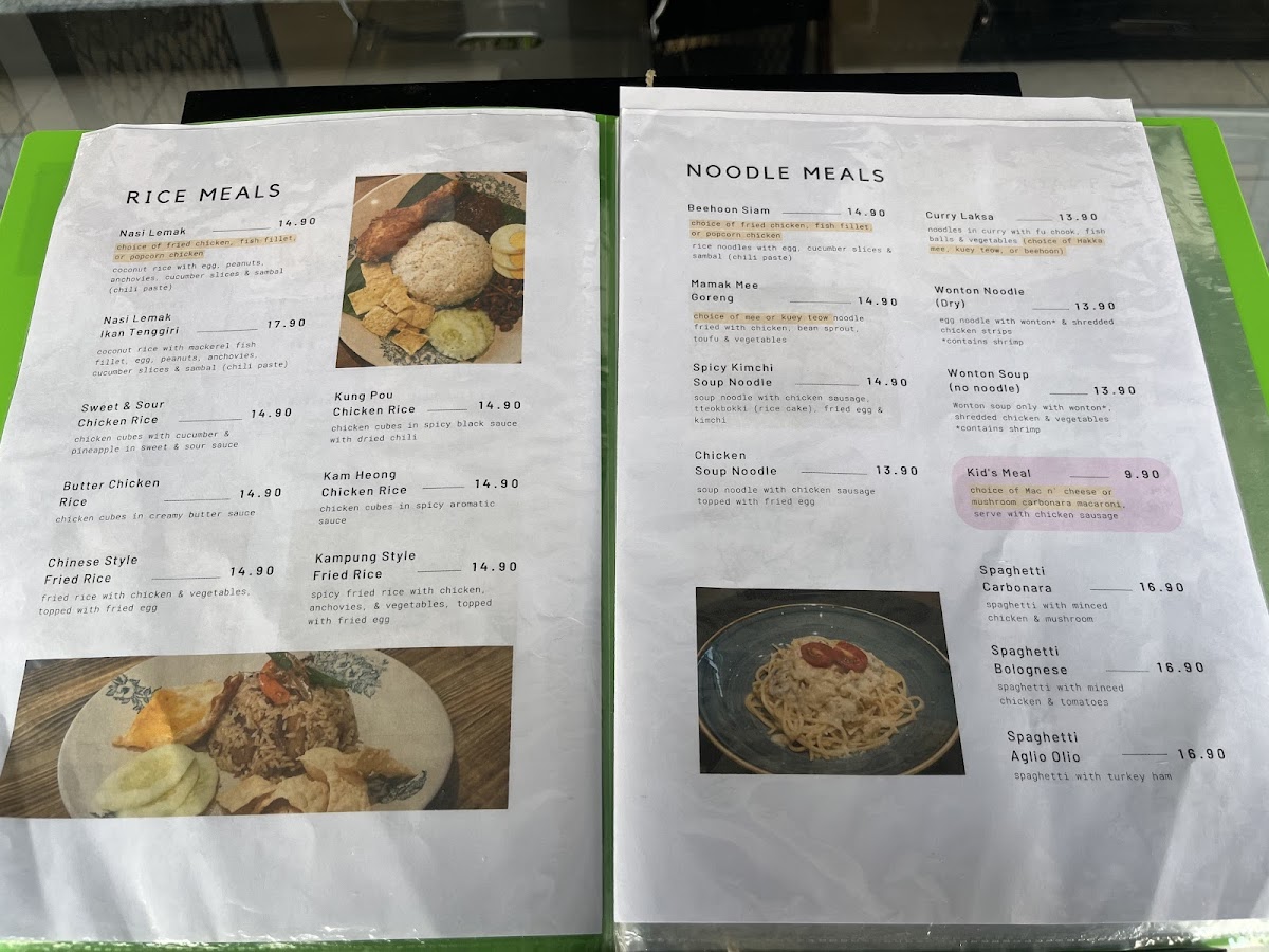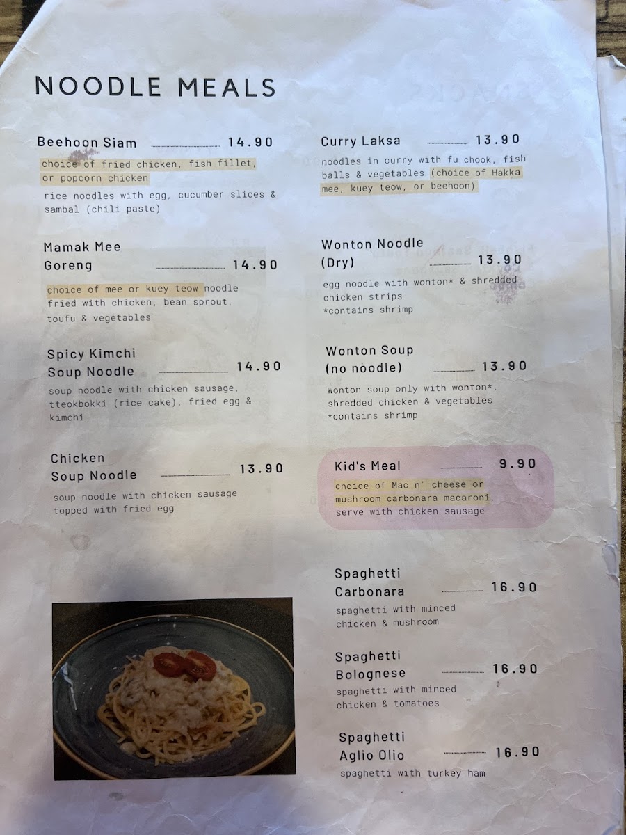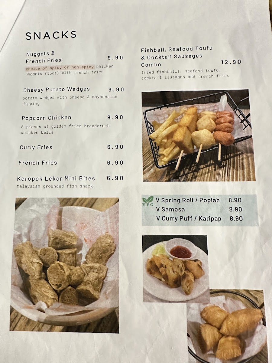 Food items are organized into categories such as noodle meals, snacks, rice dishes, and light bites. Noodle meals include choices like chicken soup noodle, dry wonton noodle, curry laksa, and spicy kimchi soup noodle, providing a range of flavors with options that may include chicken, fish balls, and vegetables. Rice dishes feature items such as sweet and sour rice and spicy vegetable fried rice. Snacks include selections like chicken nuggets with French fries, cheesy potato wedges, keropok lekor mini bites, and combos combining different fried items.