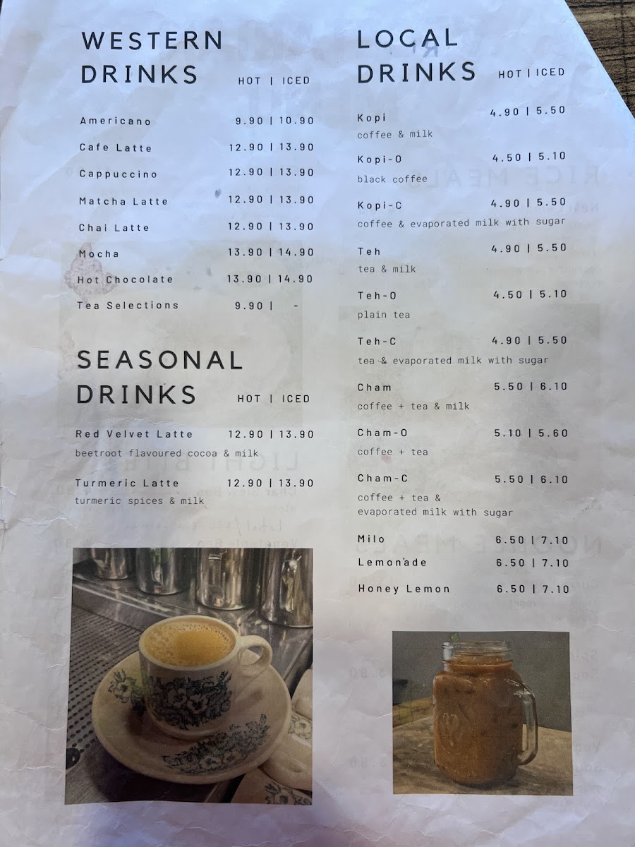 For beverages, the menu includes traditional and seasonal drinks such as Masala Tea, Kopi O, Kopi C Ice, and a hot beetroot-flavored cocoa and milk, catering to tastes seeking both coffee and tea-based options. Dessert offerings include items such as cheesecake with Oreo and Chinese steamed buns with black bean paste.